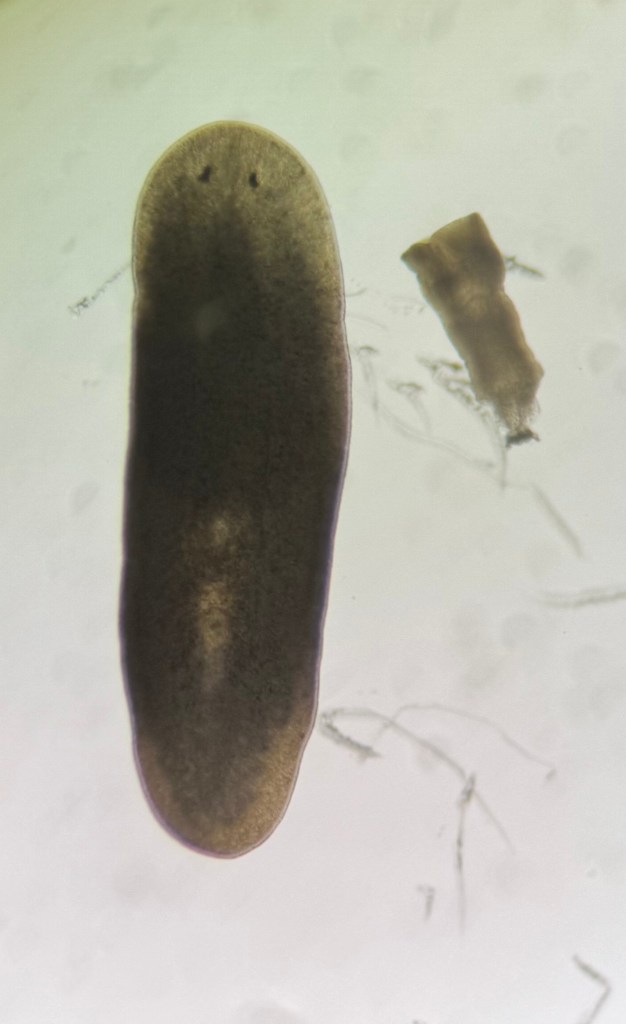 This is a planarian, specifically Schmidtea mediterranea. Over the past few months, this has become one of my most fascinating creatures. They live in freshwater and are known for their incredible regenerative power. You can cut one into a hundred pieces, and each piece can grow into a complete new animal with all the missing organs.