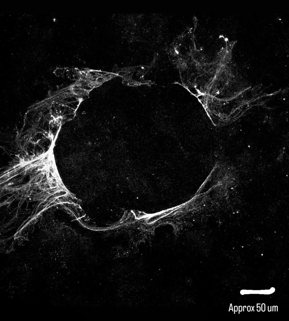 Somewhere in those steps, amid pipetting and routine motions, I tore a hole in the matrix. The image, of course, became unusable for analysis. An artifact. A mistake. And yet, what struck me afterward was not the loss of data, but the presence of that absence. This is the mother matrix: the scaffold that holds our cells together, primes them, polarizes them, guides their behavior, and quietly dictates function and fate. Praise the matrix!